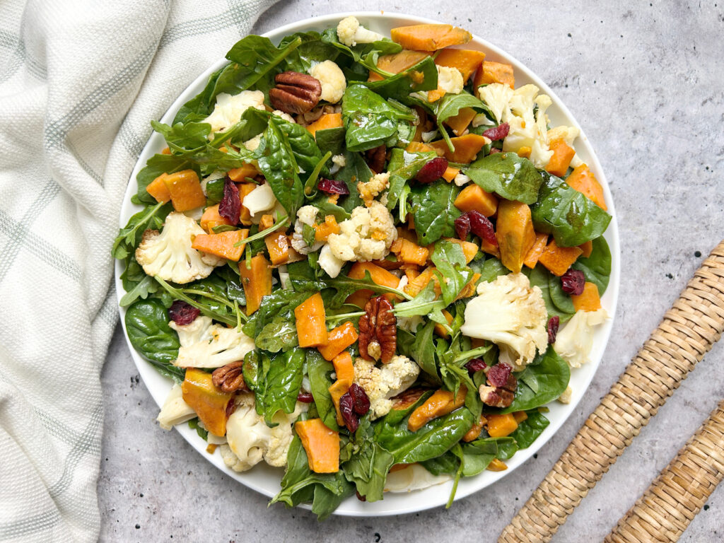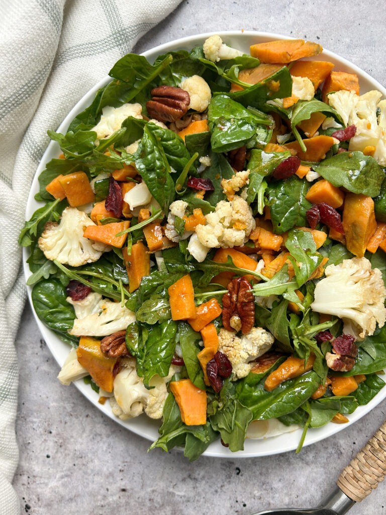 This salad is a perfect mix of sweet, savory, and crunchy elements, making every bite satisfying and full of flavor. Roasting the cauliflower and sweet potatoes deepens their natural sweetness while adding a caramelized edge that pairs beautifully with the peppery arugula. The toasted pecans bring richness and crunch, while the dried cranberries add a hint of tart sweetness that complements the maple-balsamic dressing.
